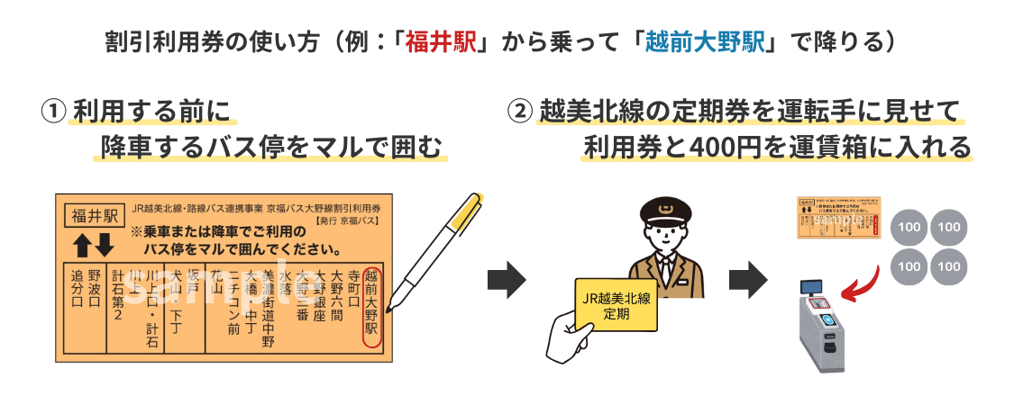 日常的にJR越美北線を利用している方は、お得に京福バスの大野線に乗車することができますので、ぜひこの機会にバスをご利用いただけたらと思います。