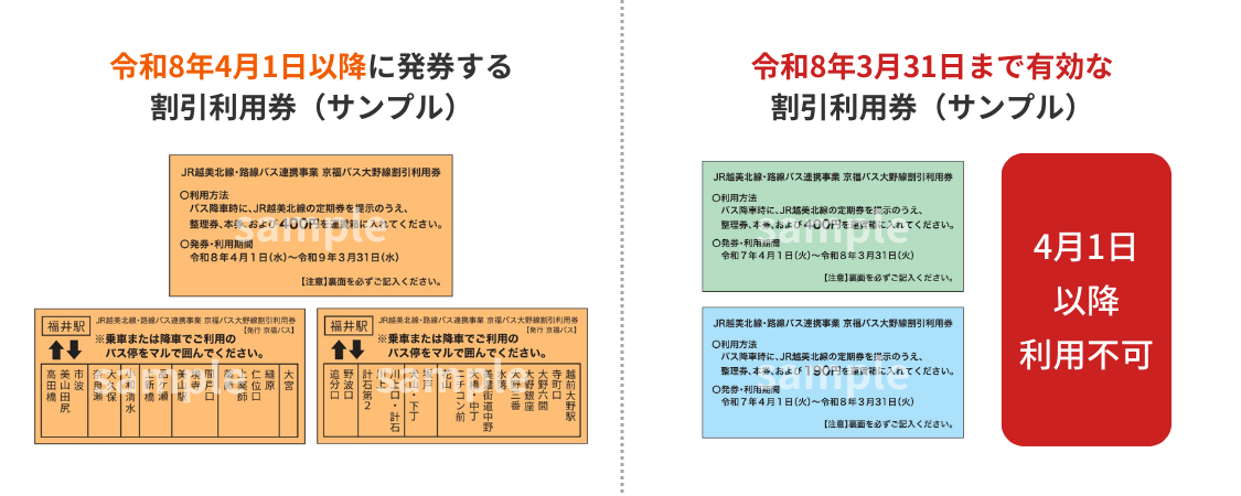 - 令和8年3月31日以前に発行した割引利用券は、原則ご利用いただけませんので、窓口に新しい有効な利用券と交換をしに来ていただくようにお願いいたします。
